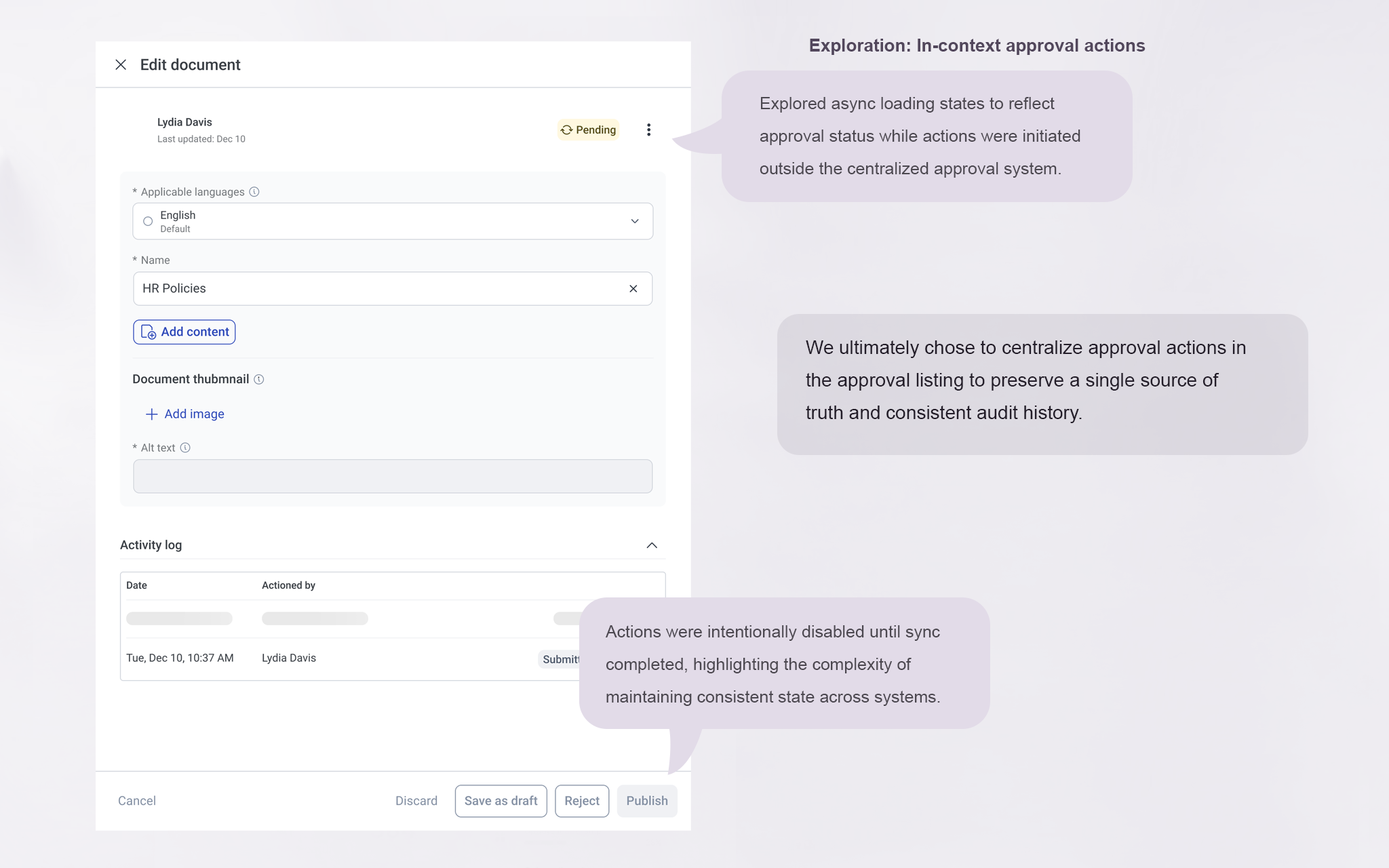 One challenge was deciding where approval actions should happen. Content could be reviewed inside Knowledge Center, but the approval system itself lived in a centralized approval listing.