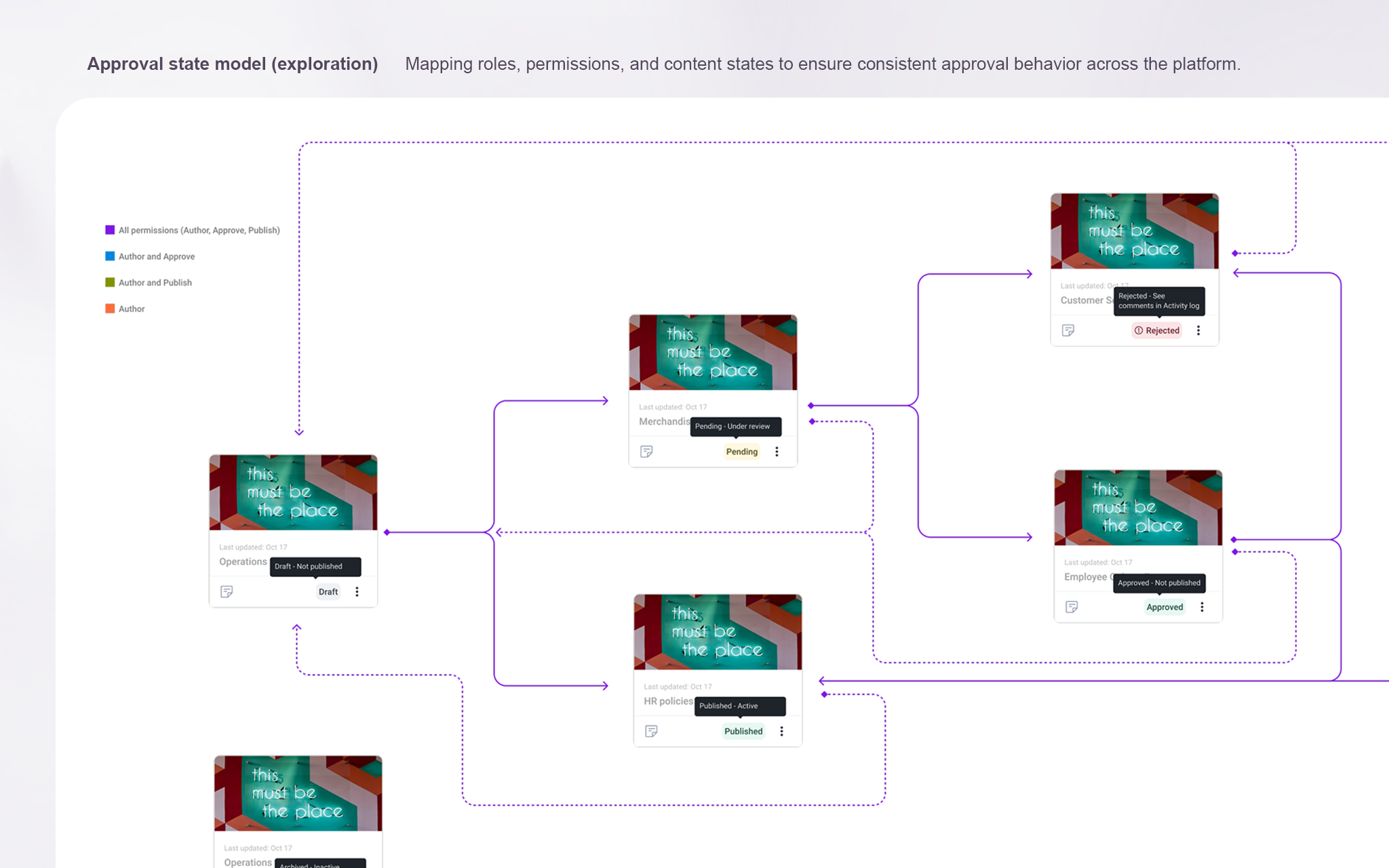 Approval state, ownership, and history are clearly surfaced at every stage, from draft to publication. By extending an existing approval model rather than introducing a parallel workflow, the system remains consistent with other platform behaviors and supports governance at scale without adding friction to everyday content creation.