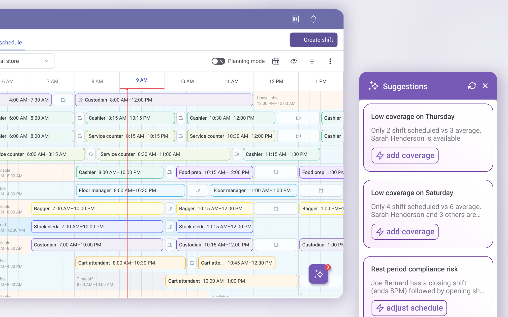 In the second iteration, planning support moved from a full-screen layer to a suggestions panel. The system highlighted issues like low coverage and compliance risks in plain language and offered clear actions without blocking progress. While this reduced trial-and-error, it also showed that pulling attention away from the schedule introduced new friction leading to a more contextual, in-flow solution.