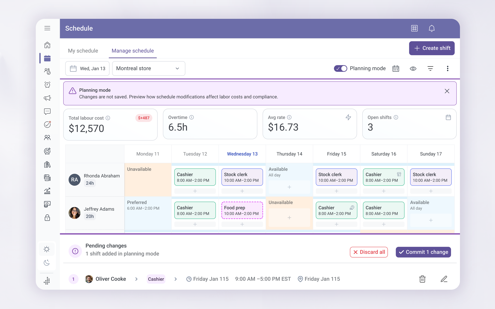 To fix this, I introduced Planning Mode to let managers try schedule changes safely before committing them. As they experimented, the system showed how changes would affect things like labor cost, overtime, and compliance. Nothing was saved until the manager was ready.