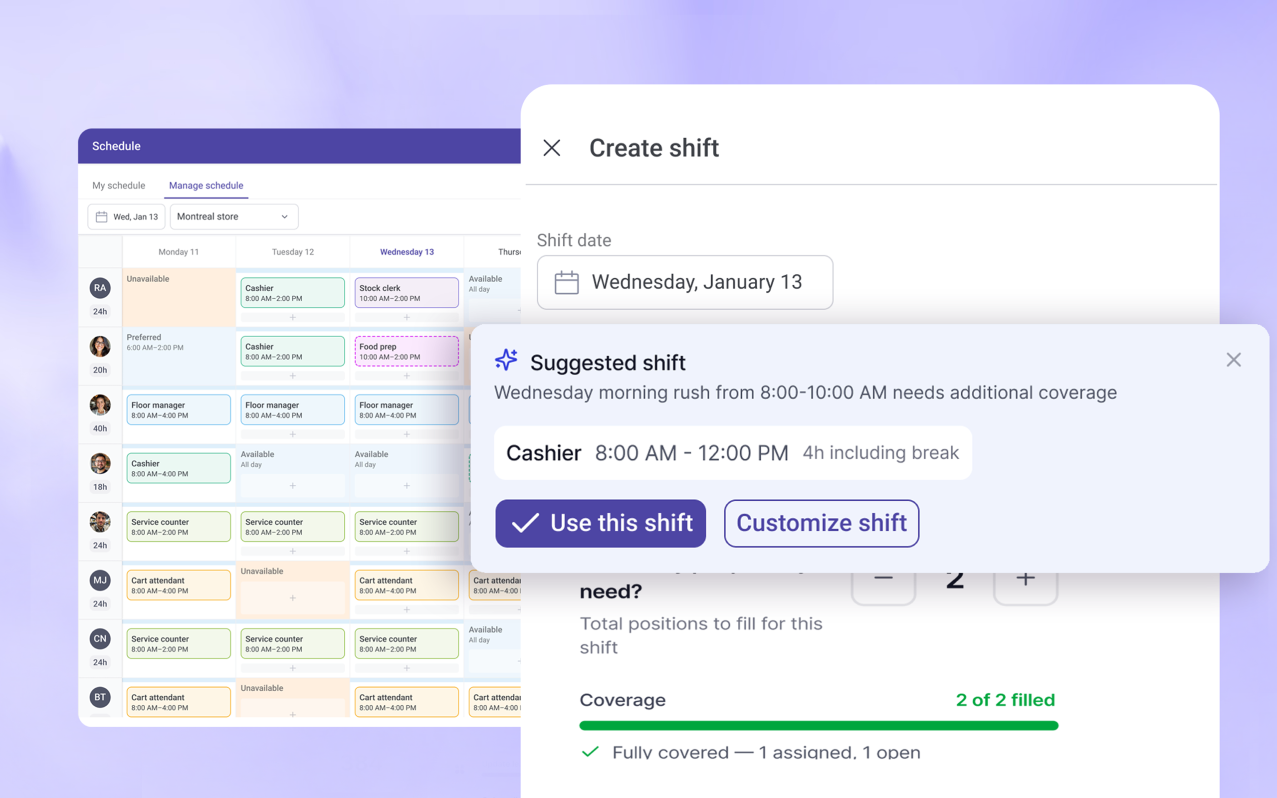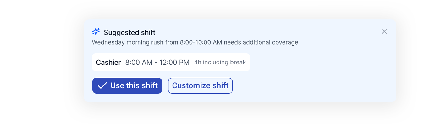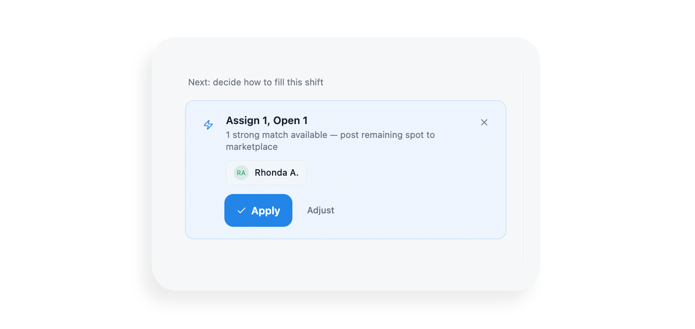 Managers often knew there was a gap. They just didn’t always know how to structure a shift to fill it. A suggested role, time, and duration gave them something to react to rather than something to construct from nothing.