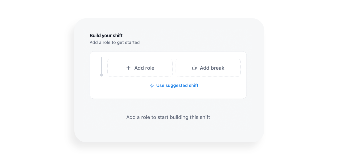 For managers who did not use a suggested shift, the system provided a guided starting point instead of a blank form. Clear prompts like “Add a role to get started,” along with inline actions for roles and breaks, reduced hesitation and helped managers begin structuring a shift with confidence.