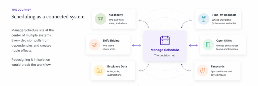 Mapping these dependencies helped clarify that Manage Schedule functioned as a decision point within a broader system.
