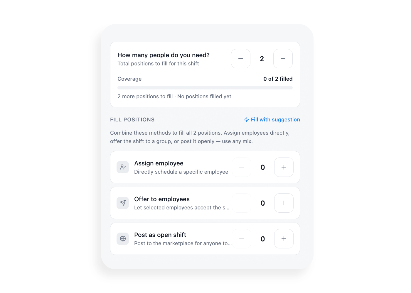 Once a shift was defined, managers had to decide how to fill it. The system supported multiple strategies, but they were presented as separate unrelated actions. The goal was to make staffing decisions explicit and predictable.