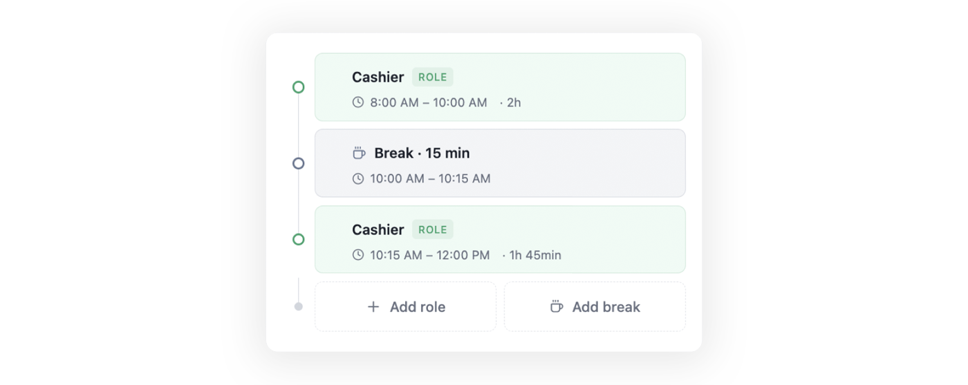 A shift is not just start and end times. It includes roles, breaks, and sequencing rules. Displaying these as a timeline made it clear that changing one part affected the whole.